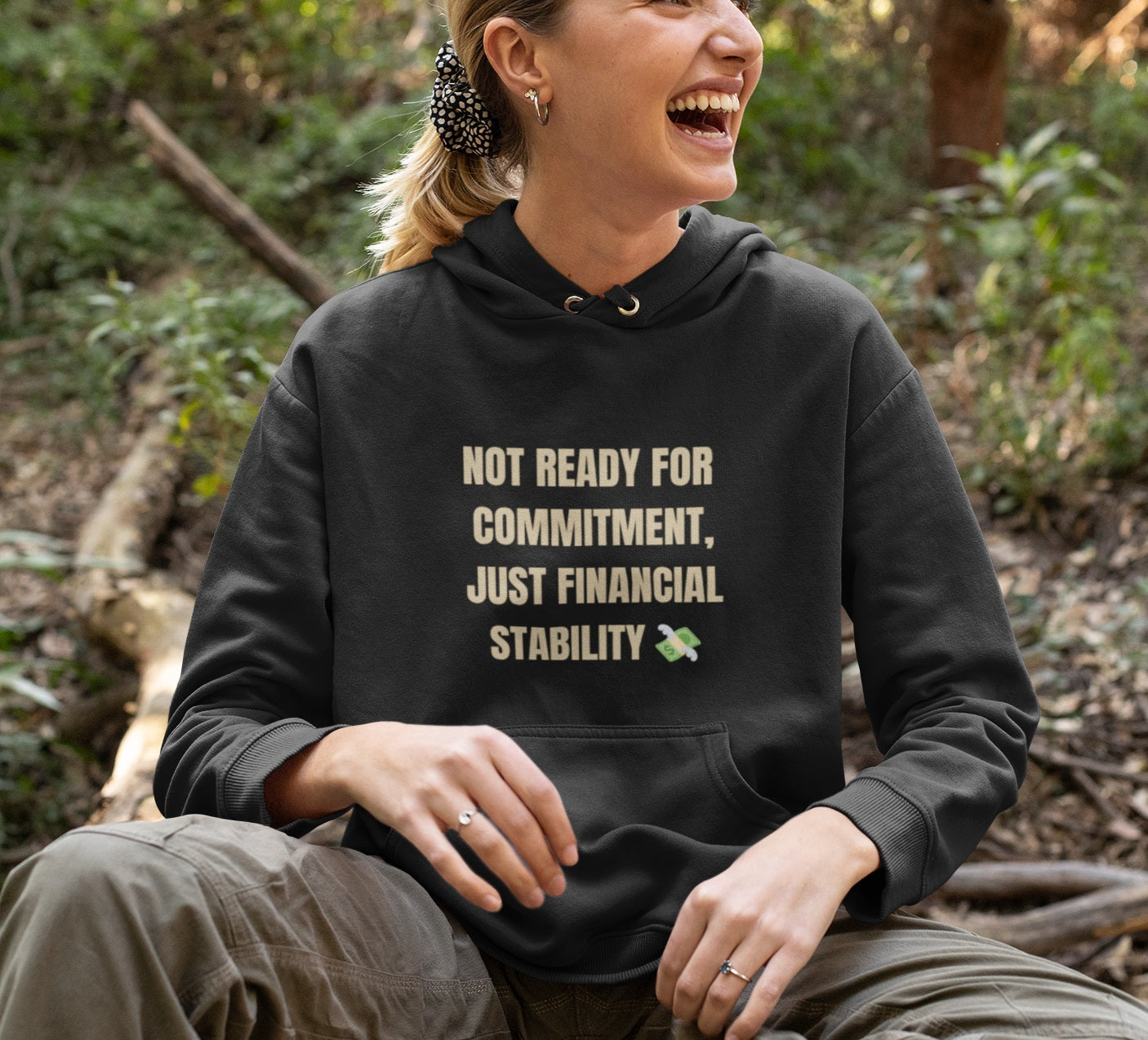 Person wearing a black hoodie with humorous text in a forest setting